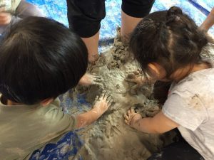 遊び込む中で、子どもたちから「粘土より固い」「ぬるぬるする」と感触を楽しんでいるような声がたくさん聞こえてきました。
