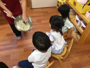 お鍋が段々と熱くなると保育室の中がとてもいい匂いで