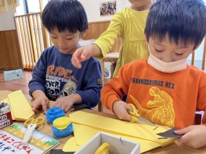 おれんじ組も12月の発表会に向けて、衣装の一部を 作成していました。 実際に絵本を見て、ひとり一人が イメージを持って、自由に表現を楽しんでいました。 「絵本とそっくりにできたよ!」と 友だち同士で見せ合いっこをしていました。