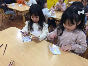途中、「難しい・・・」と挫けそうになる姿がありましたが、近くの友だちと助け合うことで