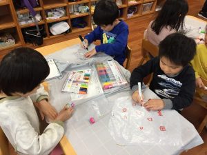 今日は、ビニール袋を使ってオリジナル凧を作っていました。