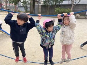 公園内の遊具で綱渡りやロッククライミングに挑戦しています。