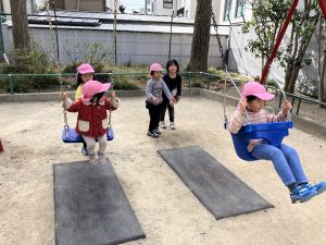 ブランコでは、あか組とおれんじ組の子どもたちが