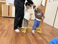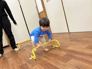 保育室に突如現れた、黄色いハードルに興味深々で、