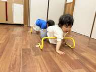 保育者がお手本のように遊び始めると、一緒に四つん這いになって進んだり