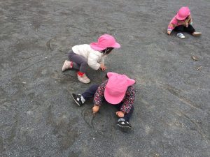おしりを地面にべったりとつけてお絵かきをじっくり