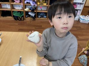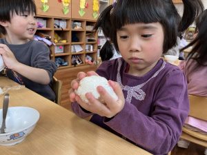 おにぎりを握っている最中に「早く食べたい!」「作ったら早き食べていい?」と