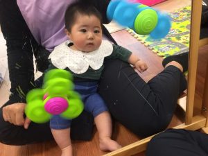 くるくる回る玩具に興味を示すと、涙もピタっと止まりました![]()