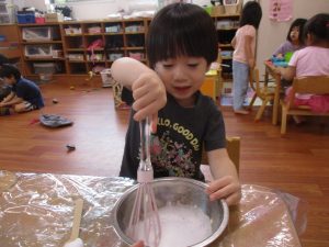 散歩に行こうと計画していましたが、雨が降ってきてしまった為お部屋で石鹸遊びのコーナーを作ると、全員が興味を持ち様々な物に見立てて遊んでいました。