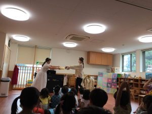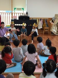 保育者の出し物、”銀の斧、金の斧”を見ると「あ!嘘ついてるよ!」とお友だちに教えてお話の世界を楽しんでいました💕