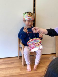 お名前を呼ばれると、嬉しそうに前に出てきて、王冠と誕生日カードをプレゼントされたお友だち。