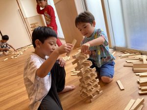 誰が一番高く積めるかな?とみんな楽しんでいました!お兄さんお姉さんは、小さいお友達に優しく「ここにおいて」と教えてあげながら一緒に遊んでいました。倒れちゃっても「大丈夫!もう一回作ろう!」と励ましてくれる逞しい姿が見られていました!
