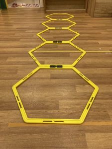 保育者の「ジャンプ!」や「いち」や「に」という数字を聞いて、一つのラダーに何回足を入れるか考えて歩いてみます。