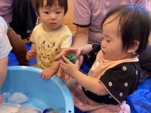 みんなで氷遊びをしました!ちょっぴり触ってみると冷たかった様子で触った直後に保育者の顔を見て様子を伺う姿が。そんな姿も可愛くて癒されてしまいます♪