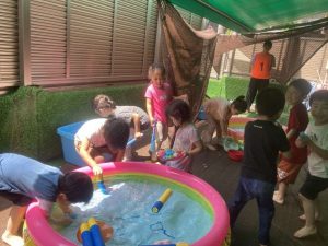 水鉄砲で友だちや先生と打ち合ってみたり、金魚すくいを楽しんだり。