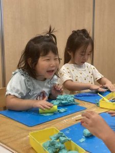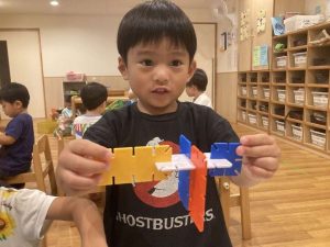 細かい手先の作業が必要なおもちゃもすっかり慣れ新しい玩具にの興味津々。自分なりに作りたいものや形を想像しながら楽しんでいます。できたものには名前を付けている子もいますよ。