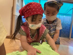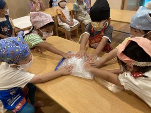 手は冷たいけれど美味しいアイスのため!と疲れも見せずお友達と協力して袋をシェイク!!美味しいアイスができたかな?おやつで食べられるのを楽しみにしている子どもたちです!