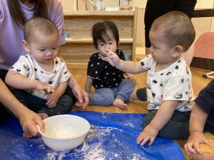 まずは粉の状態から保育者と触ってみると恐る恐る近づいて・・・。