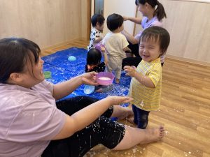 お水遊びや寒天、水風船など様々な感触遊びをして遊んできた子どもたち。