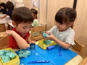 食べ物や動物だけでなく、自分でイメージした生物を作って名前を付けたり、「ここはね、、、」と仕組みまで教えてくれる子もいて、楽しいやり取りがたくさん生まれています!形を作りながら、お家で見る保護者の方の真似をして粘土を細かく刻んでいる姿も!生活が遊びに直結しているのを感じます。