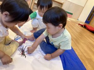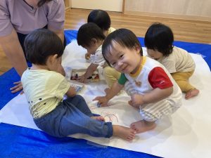力強く描く子もいれば、両手で持ってトントンと模造紙に叩きつけて描く子もいましたよ。初めての体験に興味津々だった子どもたちです!