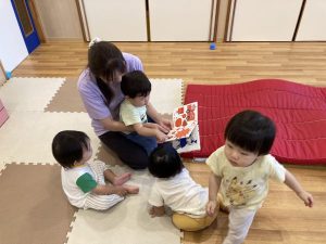 子どもたちが大好きな「どんないろがすき?」の絵本。歌いながら読み聞かせを始めると集まってきましたよ。みんな興味津々です!