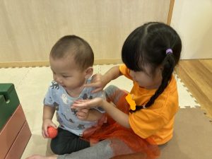 お部屋の中でお世話をしたり、一緒に遊んでみたりと、交流を深めています。