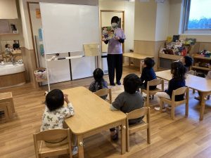 どんな時に手洗いが必要なのか、どういう風に手洗いをするのか、まずは紙芝居で教えてもらいます。