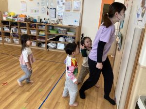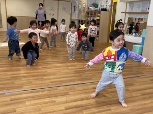最近、子ども達は「だるまさんがころんだ」が大好きで、テラスや戸外活動時に楽しんで遊んでいます!今日は体操プログラムの前に、広いお部屋を使って「だるまさんがころんだ」をしました。