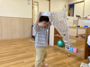 こちらのお友達は大きな新聞紙を渡すと広げて両手でバサバサ!と振ったり、そのまま隠れてばぁ!と顔を出してくれたりしました♪