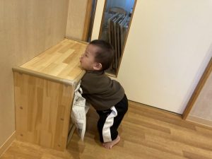 空っぽの棚に一生懸命くっついて何をしているのかな?