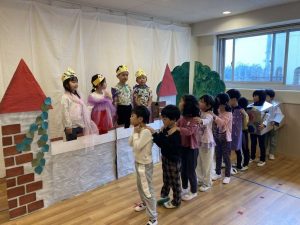 発表会で劇の発表をする子どもたち。11月から本格的に練習をしてもう1ヶ月になります。セリフや立ち位置、どのタイミングでどうやって登場するのかを1人ひとりが覚えて主体的に動けるようになってきました。