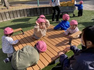 どんどんお友達が集まってみんなでベンチを囲んで太鼓を叩く真似をしたり、ベンチに登って大きく手を上げて遊びを楽しんでいましたよ!