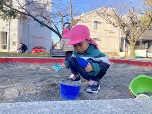 砂場遊びをしていたお友達はケーキを作ってくれました!「ハッピーバースデートゥーユー♪」と、お祝いをしていましたよ。
