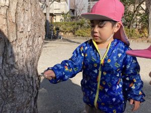 公園に着くと虫がいないか、何か発見がないか探索をしていましたよ!木の幹についているものを見つけてツンツン。色々な発見をしましたよ!