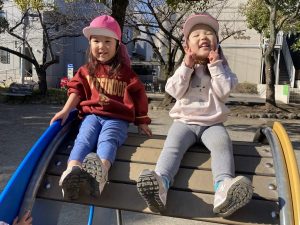 今日は久しぶりに公園に行きました。出発前に向かう公園の名前を伝えると…「やったー!」「わーい!」と、大好きな公園に行けてとても嬉しそうな子ども達。ウキウキ気分で公園に向かいました!