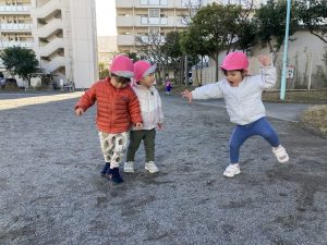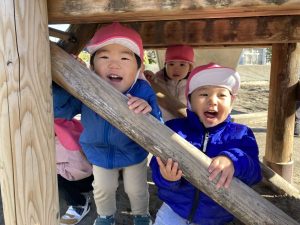 保育園を出ると向かい風に「わー!さむーい」と冬らしさを感じつつ、「えいえいおー!」と今日も元気に公園へ出発。道を歩いている時も、友達と一緒に歌ったり、言葉のやり取りを楽しんだり、寒さを感じさせない子ども達です。公園に着くと外の解放感にウキウキしながら、それぞれ好きな遊びを見つけていました。