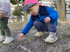 集めたどんぐりや葉っぱは大事にポケットにしまって、持ち帰っていました。いっぱい遊んで満足したのか、帰り道もご機嫌で歩いていましたよ。まだまだ寒い日が続きそうですが、寒さにまけず元気に過ごして行きたいと思います!