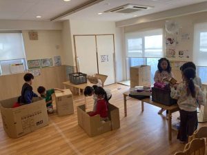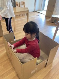 先週、段ボール遊びをした子ども達。初めてだったので、いろんな保育園が作っているお城や大きな動物、お家などの写真を見せてあげると「こんなもの作ってみたい!」と始まる前からワクワク!