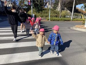 思い切り遊んで「疲れた〜」という声も聞こえましたが、帰り道も工事車両をみたり、鳩にあったりとたくさんの発見を楽しむ子ども達でした♪