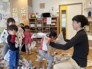 「友だちを作りましょう!」きいろ組最後の造形プログラムは、講師のこの一言から始まりました。子ども達は「?」を浮かべながらも何をするのか、ウキウキな様子。材料は新聞紙!たくさんちぎったり、自分が埋まってみたり、瓦割のように「エイヤー!」と勢いよく破ってみたり、まずは全身で感触を楽しみます。