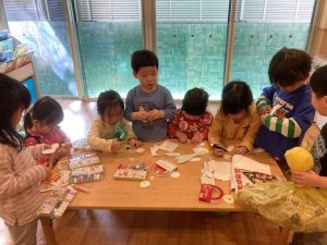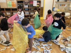 お次に登場したのはカラーポリ袋。自分で好きな色を決め、その中に「ご飯を食べさせてあげよう!」と新聞を集めて詰めていきます。最後は動物のように形作ってもらったお友達に目やリボンなどを付け、世界に一つだけの「お友達」を完成させていきます。ささッと目を描き完成をさせて、お友達の「お友達」と一緒に遊ぶのを楽しむ子、自分で画用紙を切って目の形を決め、じっくりと自分のイメージを形にする子、過程も完成したものも様々で個性が光っていました!