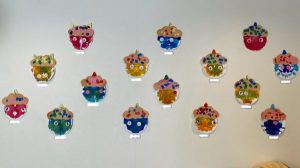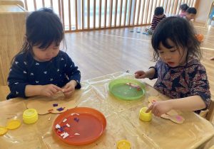 ハサミで切った後は折り紙にノリを付けて、鬼の髪を自由にデコレーションしました。子ども達の完成した作品をお部屋に飾ると、お友達や自分の作品を見つけて「あ!あった!」と嬉しそうにしていました!