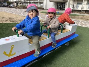 お友だちと遊ぶ姿も増えてきて、スプリングトイをお友達と協力して揺らしていたり、それを見た子が押してあげたり、遊びの中でお友だちとの関わりも楽しんでいます♪