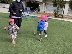 「きゃー!」と、冷たい風にびっくりしながらも、おにごっこをしたり、滑り台をすべって遊んでいましたよ!