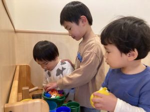 ブロックではお兄さんたちが作るかっこいい作品に夢中で「どうやるの?」「ちょうだい!」など、気持ちを知らせながら仲良く遊んでいました。年上の子達にいい刺激を受けて、遊びを真似したり、遊び相手になってもらったり、仲良く過ごしている様子がとても微笑ましかったですよ!