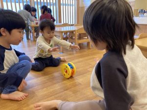 今日は1歳児クラスに、4歳児の子ども達が遊びに来てくれました。日ごろから一緒にお散歩に行ったり、きょうだいの子がいたり、子ども達も大喜びで遊び始めていました!