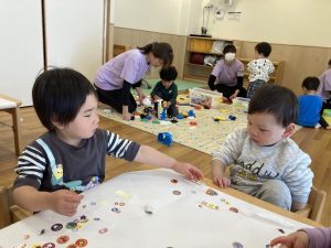 一緒にシール貼りをしようと座ったあお組さんに、シールを「どうぞ」と渡してあげてました。