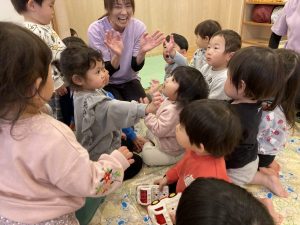 今日はかわいいかわいいあお組さんとの合同保育。あお組さんがお部屋に来る前から、とっても楽しみにしていたそら組さん!「いっしょにあそぶの!」と意気揚々な様子でした!