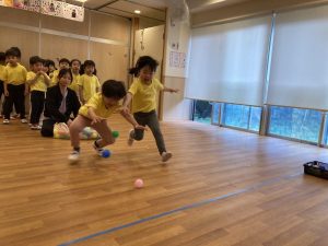 講師が一度に3つのカラーボールを持ち、それを同時に転がし、転がすときに1つの色を言います。子どもたちはその色のカラーボールを目指して追いかけ、取れた方が勝ちです。取れなかった子は残りの2つのボールを拾い、また列に並びます。何色を言われるか耳で聞き、それがどこにあるのか見ながら追いかける、何個も同時にやらなければいけませんが、何回もやるうちに素早く取れるようになりました!